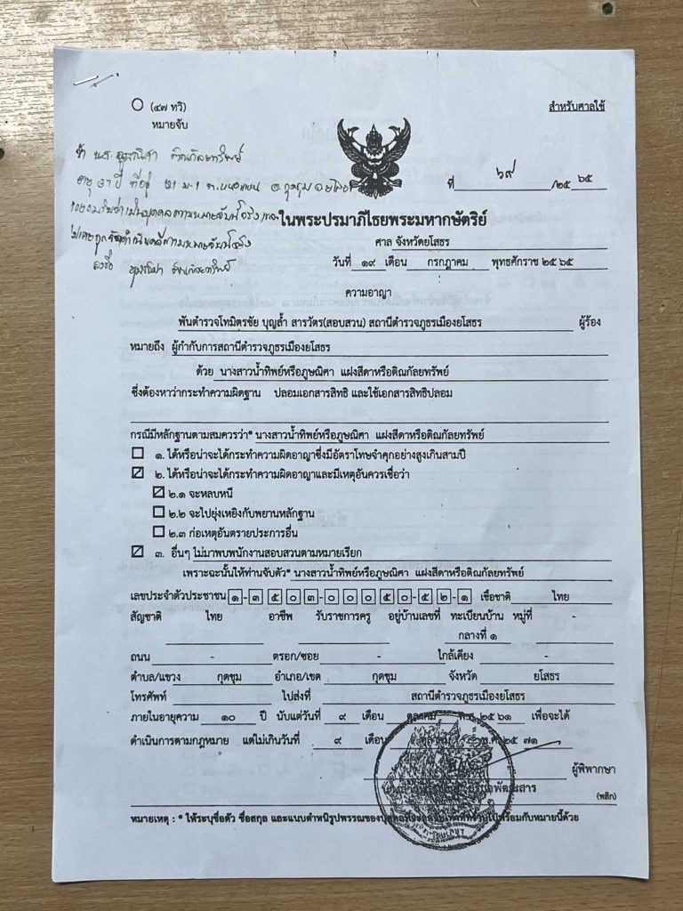 ฐานความผิดข้อหา : “ปลอมเอกสารสิทธิ และใช้เอกสารสิทธิปลอม” (จับตามหมายจับศาลจังหวัดยโสธร ที่ 69/2565 ลง 19 กรกฎาคม 2565)