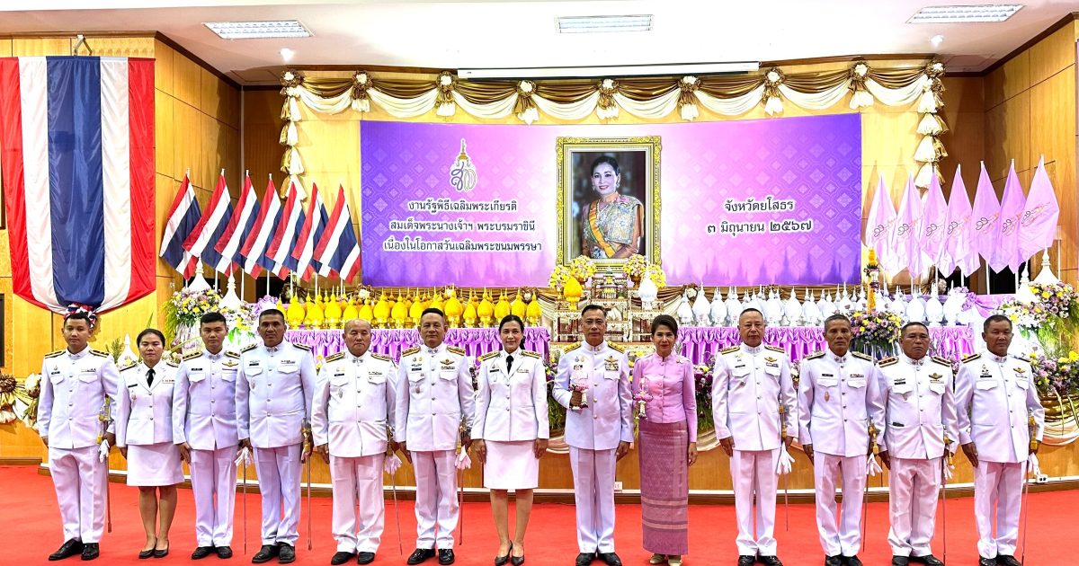 พล.ต.ต.ภิรมย์ สวนทอง ผบก.ภ.จว.ยโสธร มอบหมาย พ.ต.อ.เศวก โพนทัน รอง ผบก.ภ.จว.ยโสธร เป็นตัวแทนตำรวจภูธรจังหวัดยโสธร พร้อมด้วย พ.ต.อ.ประสิทธิ์ เพชรรัตน์ ผกก.สภ.เมืองยโสธร , พ.ต.ต.สมคิด ทองศรี สวป.(ชส.)สภ.เมืองยโสธร ข้าราชการตำรวจในสังกัด ร่วมกับหัวหน้าส่วนราชการ หน่วยงานรัฐวิสาหกิจ องค์กรเอกชน ข้าราชการตำรวจในสังกัด ร่วมกิจกรรมเฉลิมพระเกียรติสมเด็จพระนางเจ้าสุทิดา พัชรสุธาพิมลลักษณ พระบรมราชินี พิธีถวายเครื่องราชสักการะวางพานพุ่ม และพิธีจุดเทียนถวายพระพรชัยมงคล เนื่องในโอกาสวันเฉลิมพระชนมพรรษา ๓ มิถุนายน ๒๕๖๗ โดยมี นายชรินทร์ ทองสุข ผู้ว่าราชการจังหวัดยโสธร เป็นประธานในพิธี