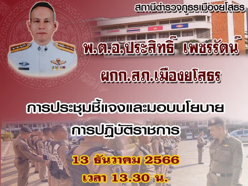 12 ธันวาคม 2566 พ.ต.อ.ประสิทธิ์ เพชรรัตน์ ผกก.สภ.เมืองยโสธร เข้ารับการดำรงตำแหน่ง ผู้กำกับการ